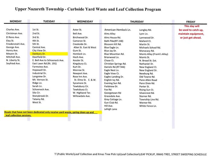 You can find the schedule for leaf pickups here: https://cms2.revize.com/revize/uppernazarethtwppa/Document%20Center/Department/Public%20Work/Leaf-Pick-Up%20(1).pdf
